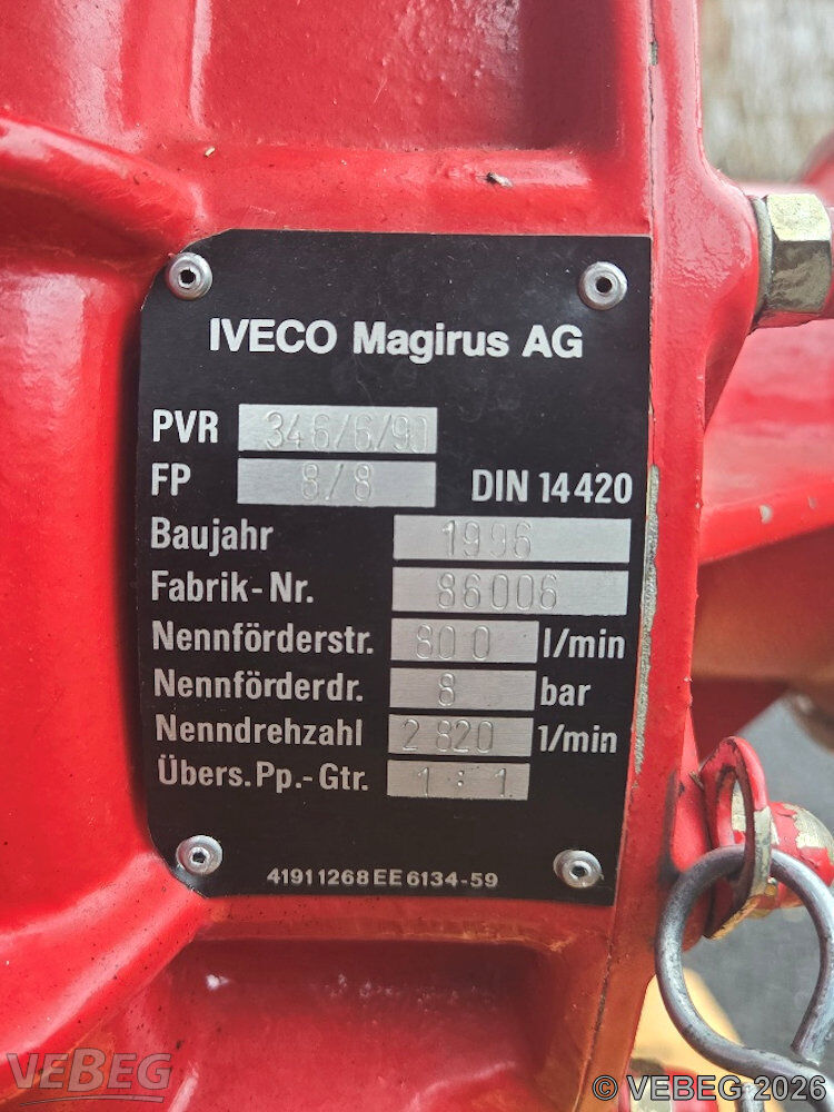 ca. 73 Betriebsstunden, Baujahr 1996, S/N 86006; Nennförderstrom 800 l/min, Nennförderdruck 8 bar, Nenndrehzahl 2.820 1/min; mit Motor Fiat 156 A 2.000, S/N 6953729, 32 kW, 3.500 - 5.000 1/min.