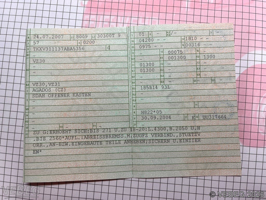 | Daten| Erstzulassung: | 07/07 | | Fahrgestellnummer: | TKXV311137ABA5356 | | Farbe: | grau |