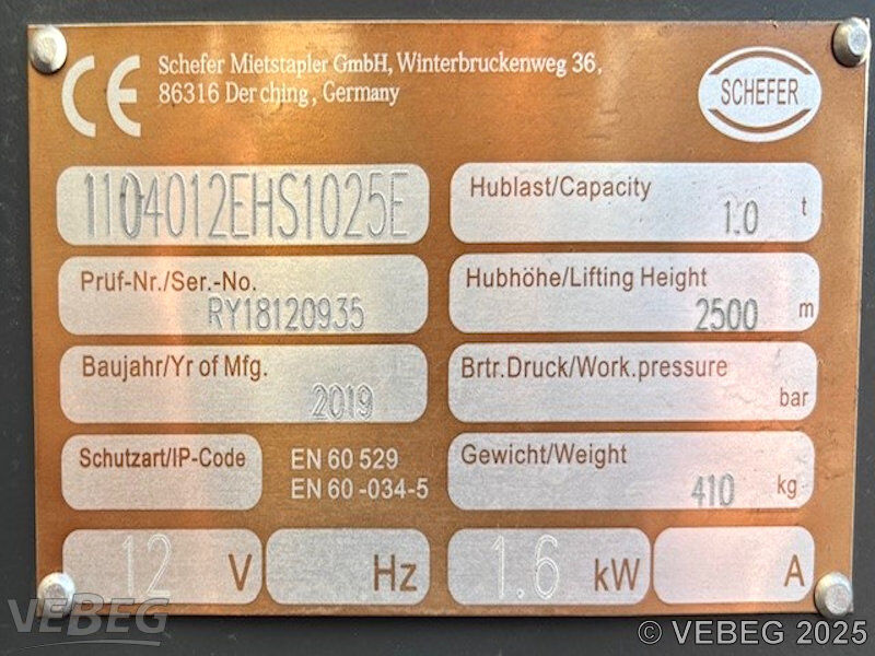 Baujahr 2019, S/N RY18120935; Hublast 1.000 kg, Hubhöhe 2.500 mm, elektrisch heben und senken, manuell fahren; mit Batterie und Ladegerät.