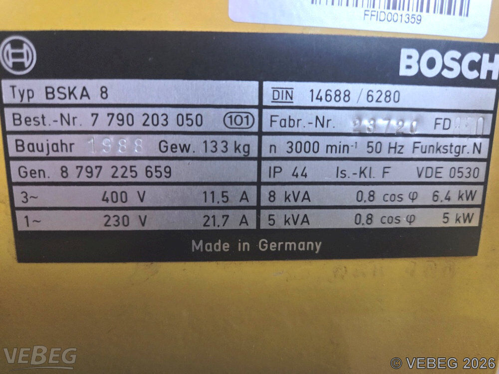 ca. 163 Betriebsstunden, Baujahr 1988, S/N 23720; 3.000 1/min, 230 - 400 V, 50 Hz, 11,5 - 21,7 A, 5 - 8 kVA, 5 - 6,4 kW;