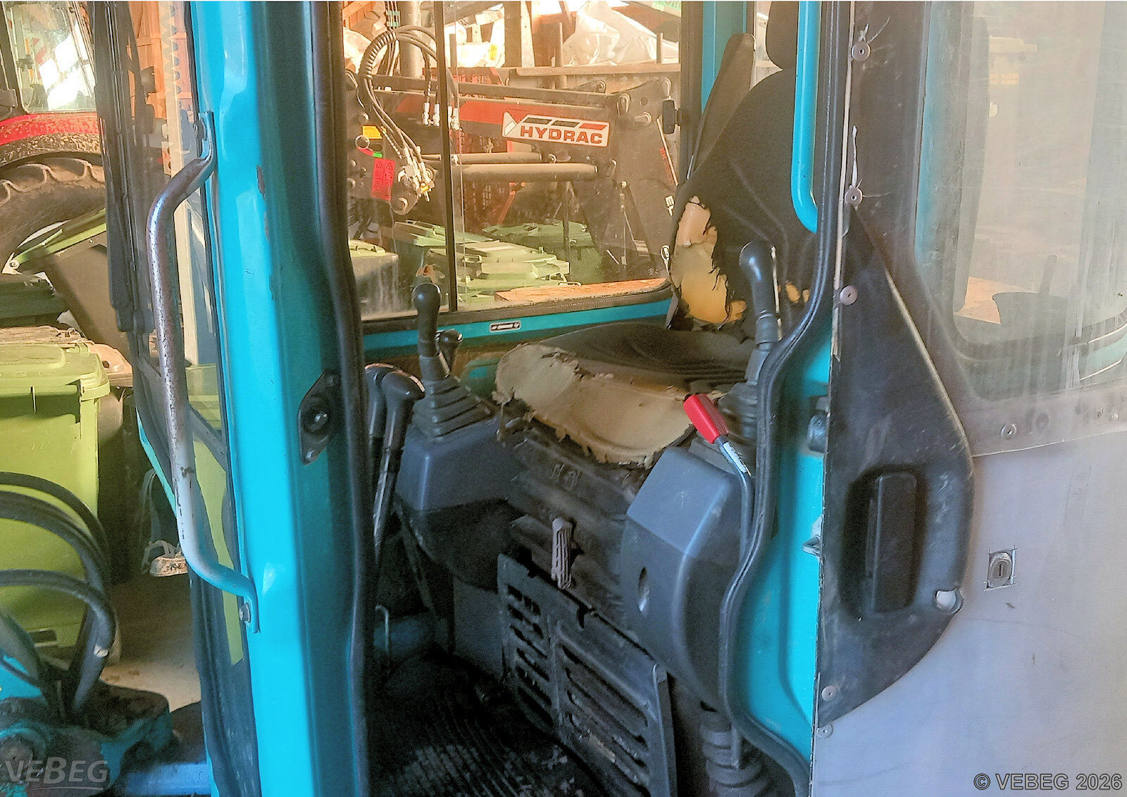 Lager und Bolzen des Auslegearms bei ca. 3.200 Betriebsstunden erneuert; Sitz verschlissen, Gebrauchsspuren, alters- und nutzungsbedingter Verschleiß.