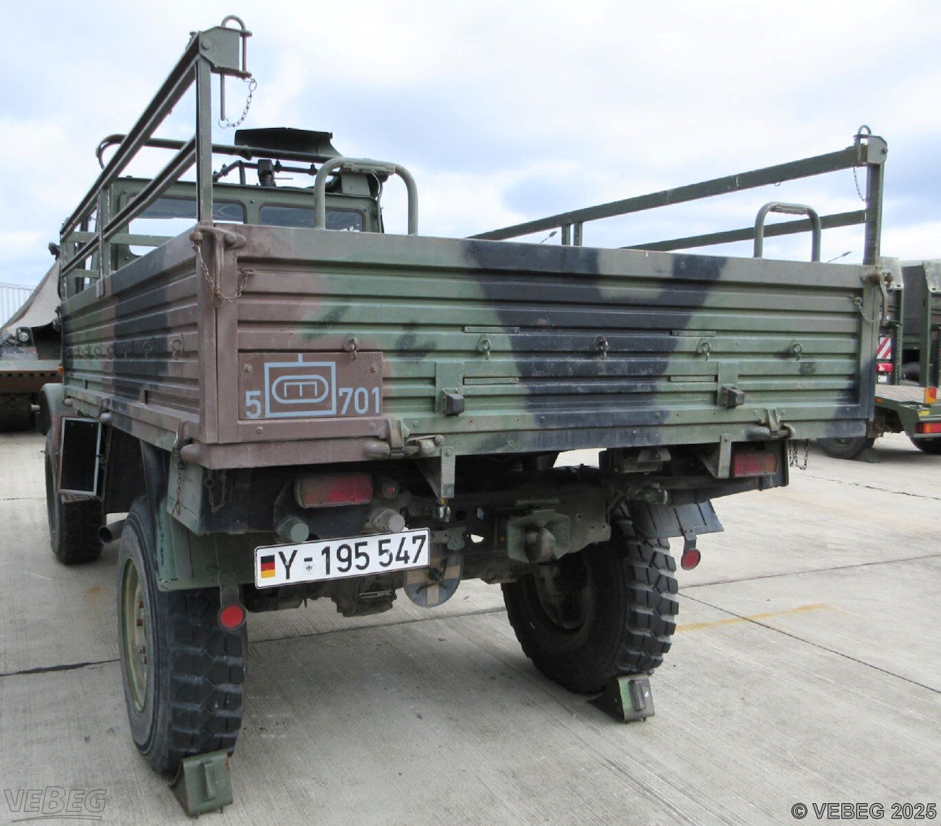 BemerkungenTermine für Besichtigung oder Abholung sind mit der zuständigen Lagerortdienststelle verpflichtend vorab per Telefon /oder E-Mail zu vereinbaren.Ausfuhrgenehmigungspflichtig [Info] . Die Rechnungsstellung erfolgt zuzüglich der gesetzlichen Umsatzsteuer. GebotsbasisStückBitte beachten Sie auch die Hinweise und Bedingungen im Vorspann zu dieser Ausschreibung: Die von der VEBEG angebotenen Fahrzeuge stammen aus Aussonderungen ihrer Auftraggeber. Einzelheiten zum Zustand der jeweiligen Fahrzeuge entnehmen Sie bitte den Lostexten. Zusätzlich verweisen wir ausdrücklich auf Abschnitte B und G unserer Allgemeinen Geschäftsbedingungen (AGB). Fahrzeuge die nach Einschätzung der VEBEG der Ausfuhrgenehmigungspflicht unterliegen, sind mit Verweis auf die Punkte E3 und E4 unserer AGB entsprechend gekennzeichnet. Zum Gebotspreis kommt die gesetzliche Umsatzsteuer hinzu. Die Differenzbesteuerung gemäß § 25a UStG wird nur angewendet, wenn dies ausdrücklich in der jeweiligen Ausschreibung angegeben ist. | Lagerort / StandortBundeswehrPzPiBtl 701 Pionierkaserne Zum Hain 1 Tel.: 036695 86-0 Herr Hollstein Durchwahl: 3145 07554 Gera |