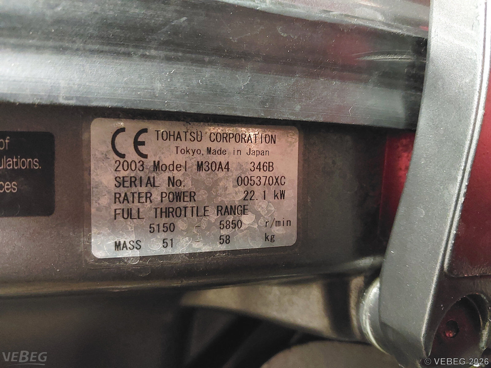Motor Tohatsu M30A4, Baujahr 2003, S/N 005370XC, 22,1 kW (30 PS);