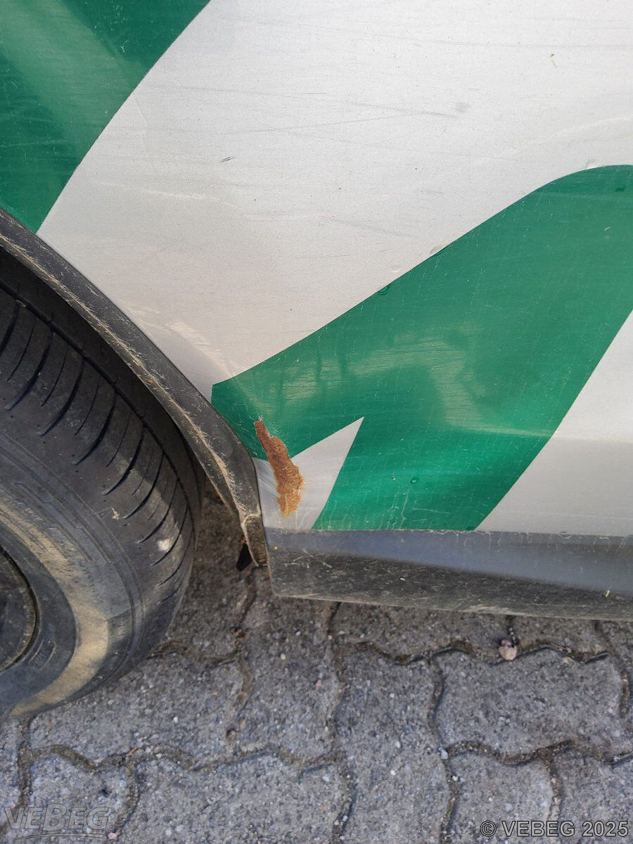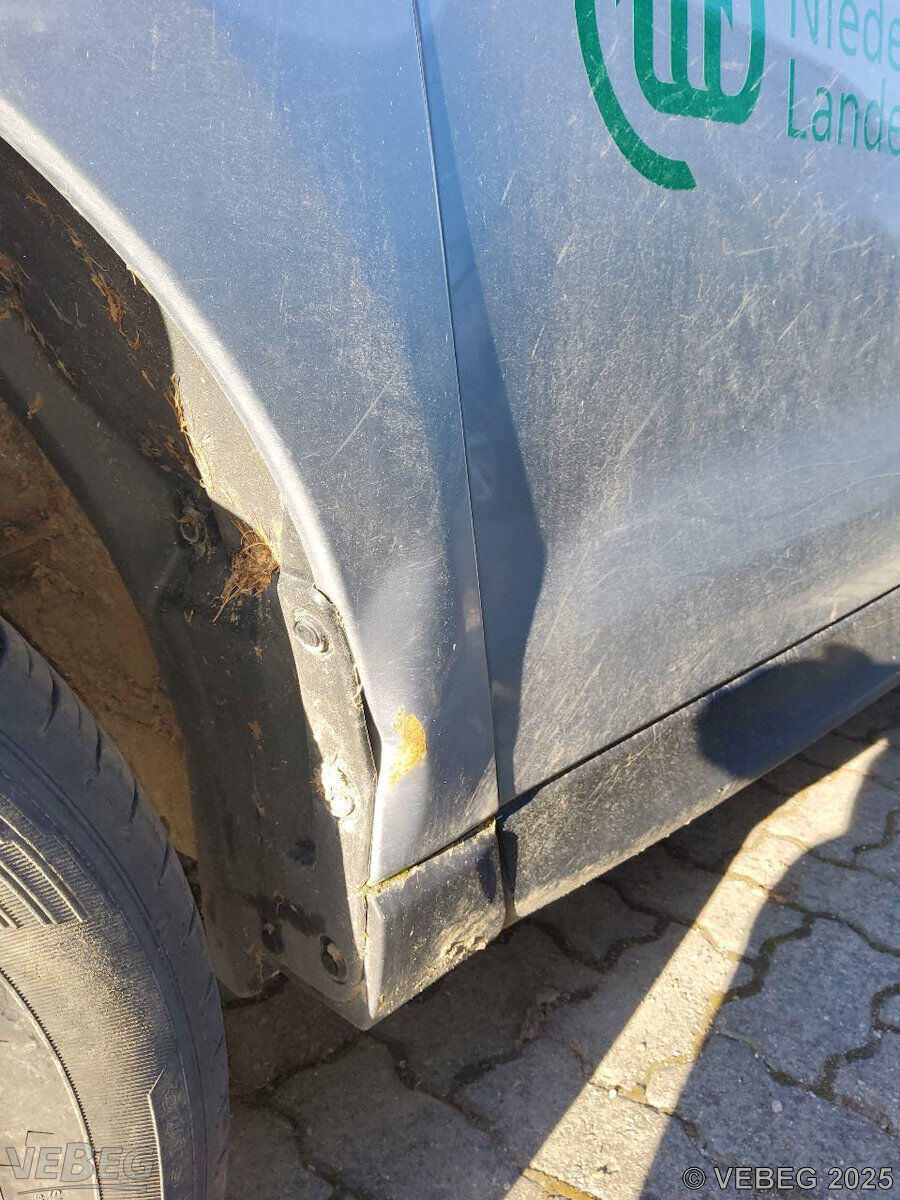 Kotflügel links und Tür hinten rechts gestaucht, Stoßfänger vorn und hinten verschrammt, Heckklappe beschädigt, Scheinwerfer links verschürft, Spiegelgehäuse links und rechts gebrochen, Kupplungspedalgummi fehlt, Dachhimmel und Innenraum verschmutzt, Sitze hinten aufgerissen, Lackschäden, Kratzer, Dellen, Gebrauchsspuren, Korrosion, alters- und nutzungsbedingter Verschleiß, HU 09/26.