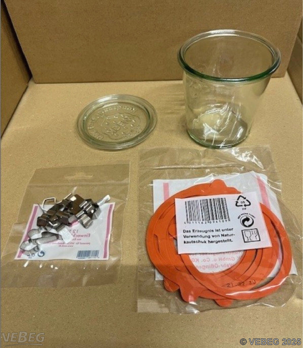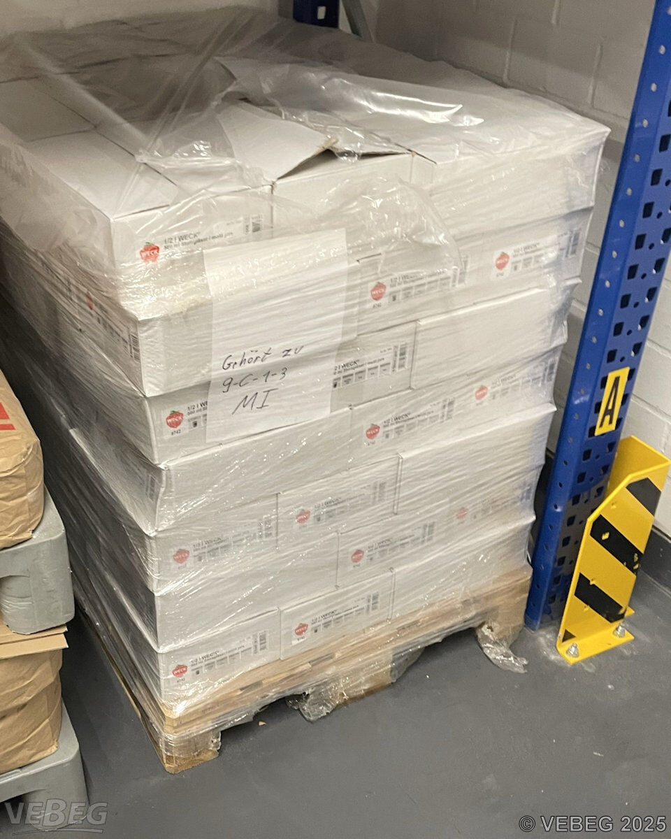 568 Sturzgläser, 0,5 l, 580 mi, 742 Weck sowie 224 Klammern, in Beutel zu je 12 Stück verpackt; 130 Gummiringe, in Beutel zu je 10 Stück verpackt; auf 1 Palette gelagert und gestretcht.
