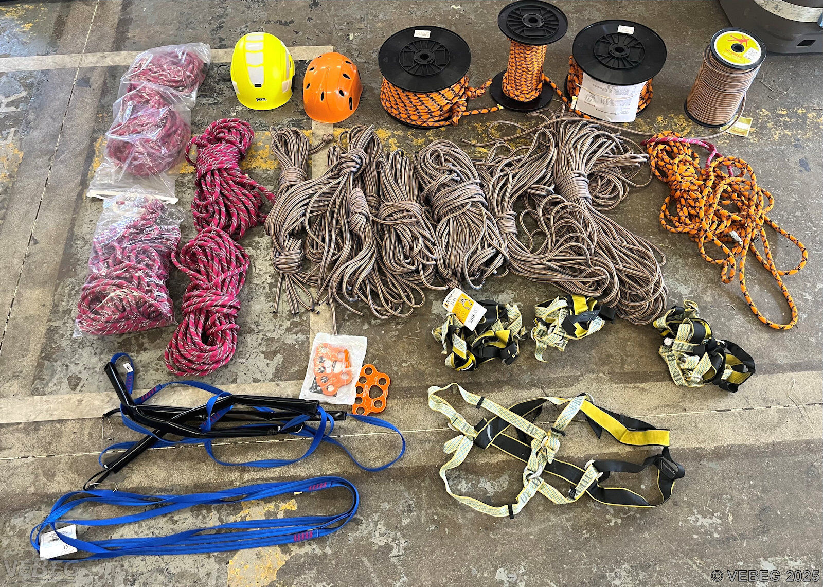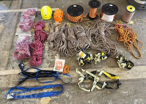 verschiedene Sicherungsseile, Gurte, Schutzhelme sowie 50 Kunststoffkisten für Ausbildung Kistenstapeln;