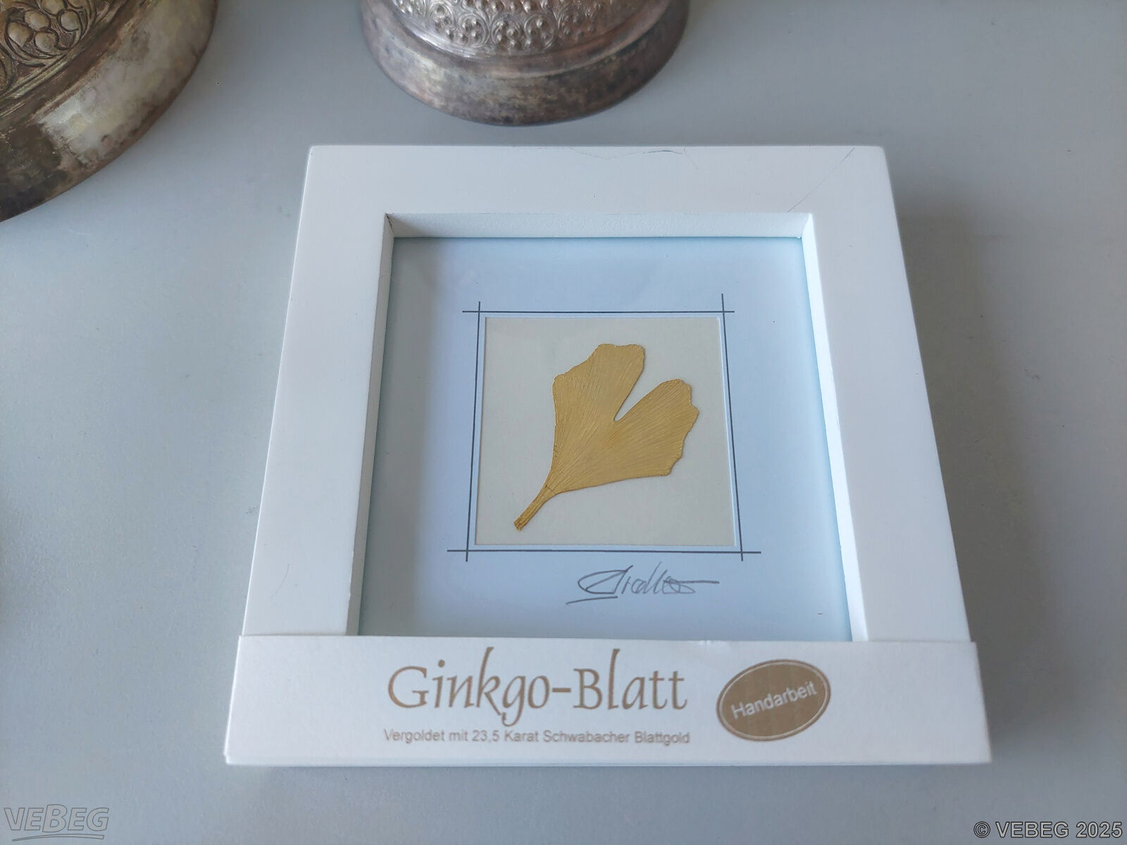 1 vergoldetes Ginkgoblatt, 23,5 Karat, Schwabacher Blattgold, im Holzrahmen, ca. 13 x 13 cm;