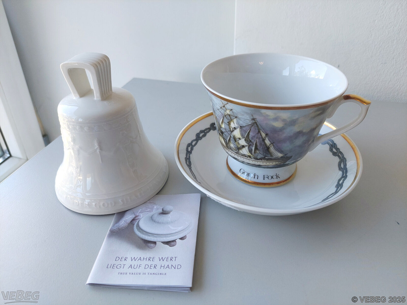 1 Porzellantasse mit Unterteller, Motiv Gorch Fock, Höhe ca. 12 cm;