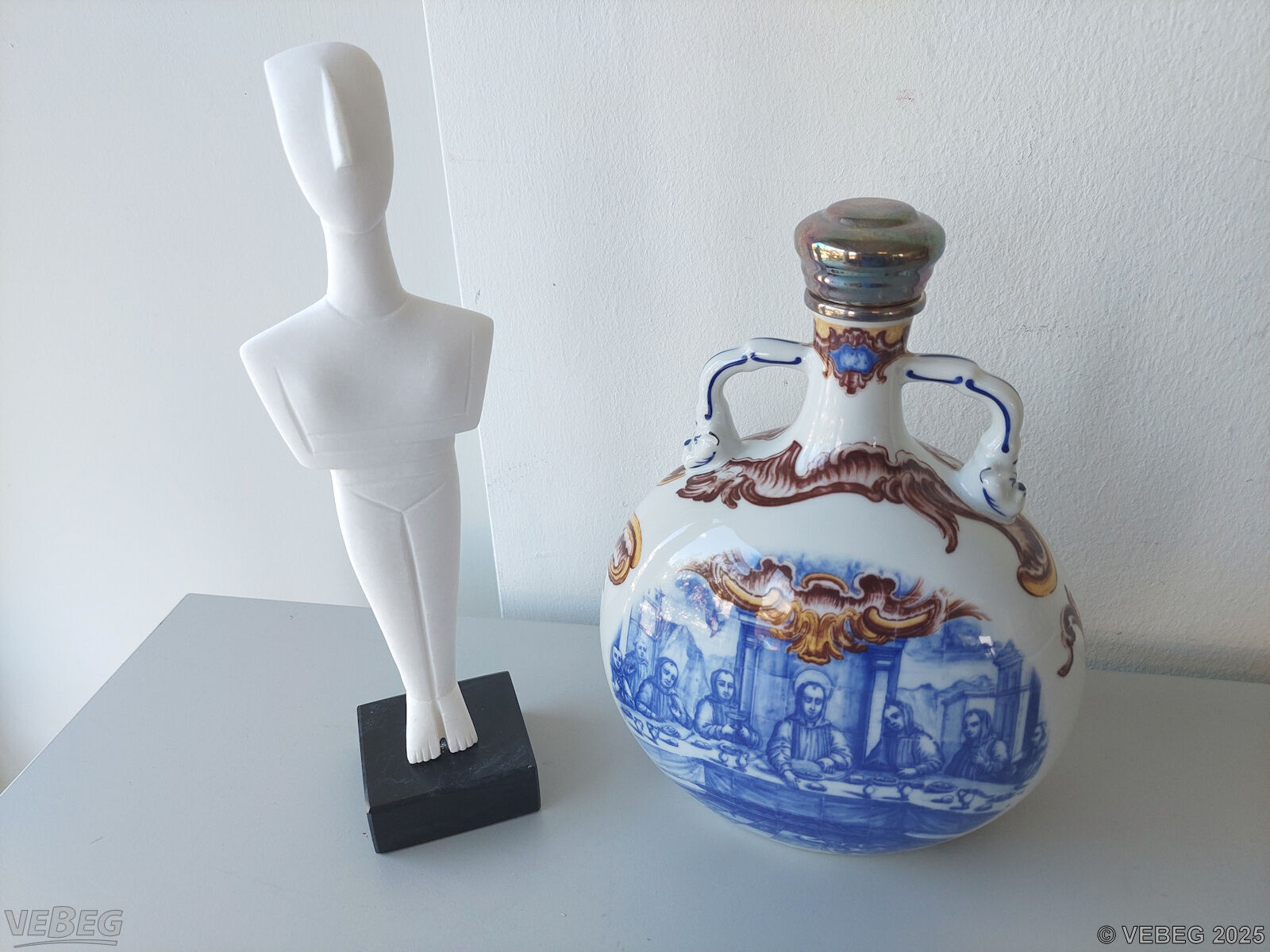 1 Keramikkaraffe, Vista Alegre, Portugal, Motiv Mönchsrefektorium, mit versilbertem Deckel, Höhe ca. 22 cm;