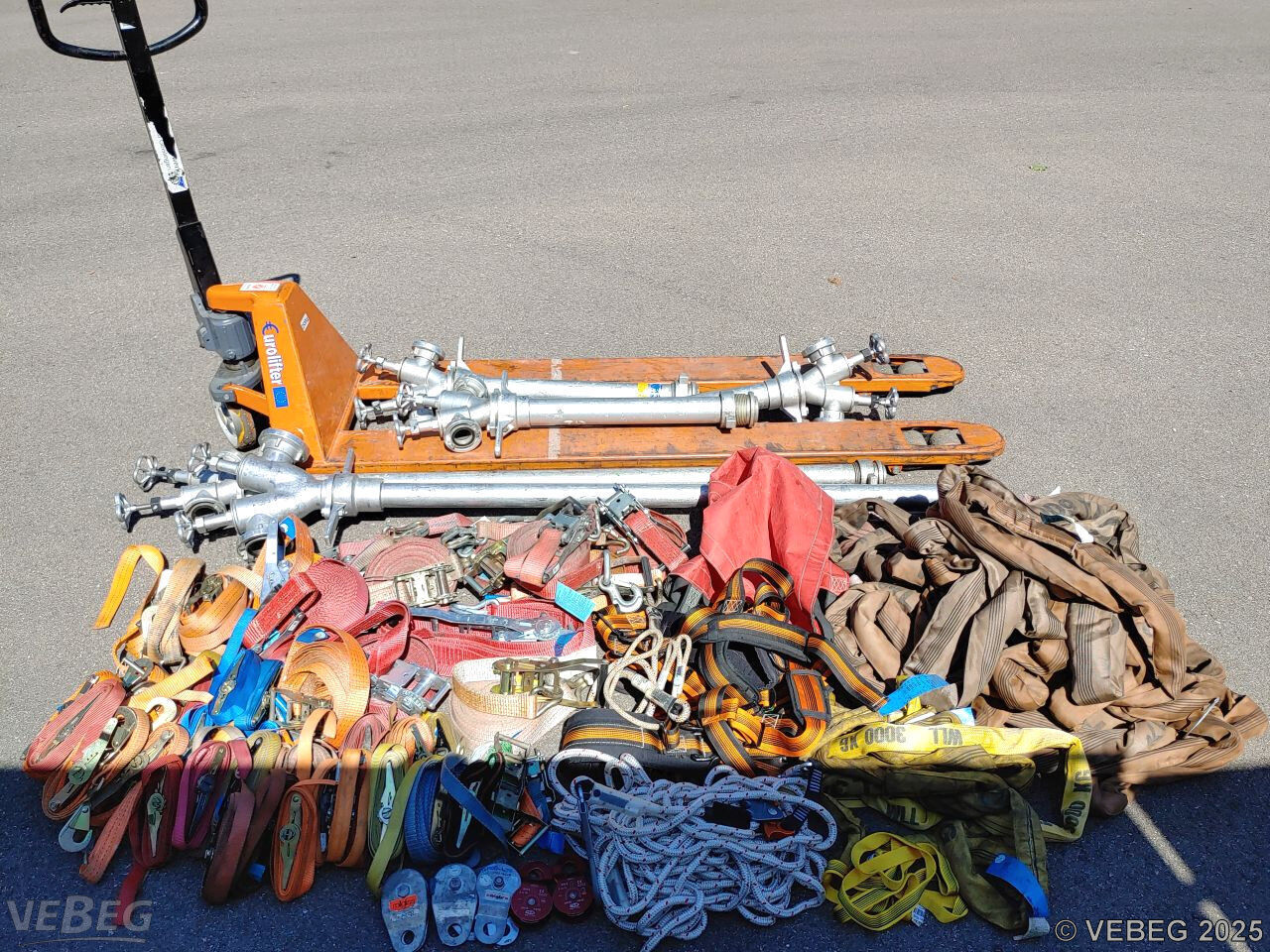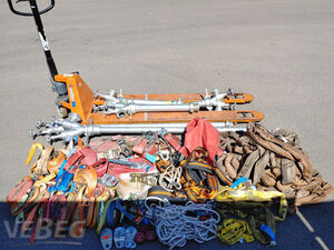 55 Ratschenzurrgurte 500 - 2.500 daN; 5 Standrohre; 1 Hubwagen 2,5 t, Gabellänge 180 cm;