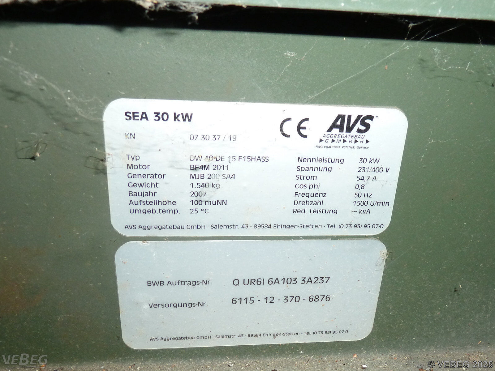 Stromversorgungsaggregat 37,5 kVA/30 kW AVS Aggregatebau DW 40 DE 15 F14HH