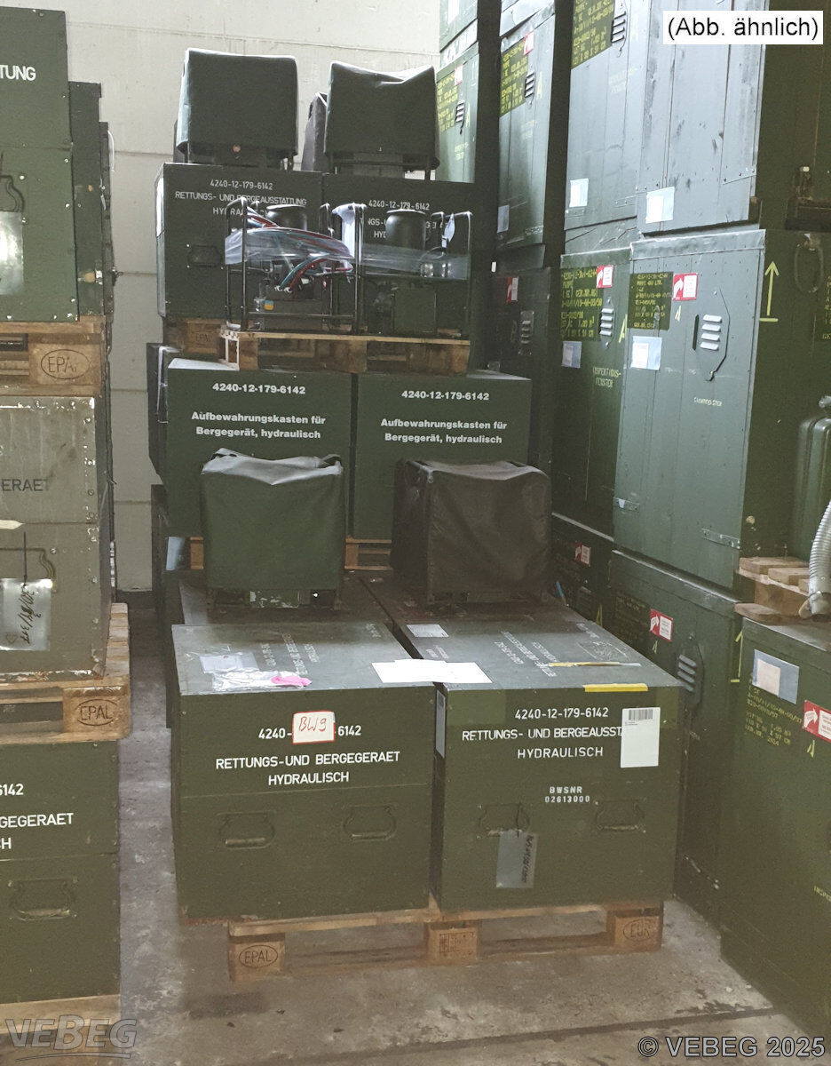 BemerkungenTermine für Besichtigung oder Abholung sind mit der zuständigen Lagerortdienststelle verpflichtend vorab per Telefon /oder E-Mail zu vereinbaren.Die Beachtung der Sicherheits- und Zulassungsvorschriften bei der Nutzung, sowie die Einholung der entsprechenden Genehmigungen sind Sache des Käufers. Für Schäden, die durch Verletzung der Sicherheits- und Zulassungsvorschriften verursacht werden, die durch ungeeignete oder unsachgemäße Verwendung, fehlerhafte Inbetriebnahme und/oder Montage durch den Käufer oder Dritte, übliche Abnutzung, fehlerhafte oder nachlässige Behandlung entstehen, haftet die VEBEG und deren Auftraggeber ebensowenig wie für die Folgen unsachgemäß vorgenommener Änderungen oder Instandsetzungen des Käufers oder Dritter. Der Käufer stellt die VEBEG und deren Auftraggeber von allen in diesem Zusammenhang erhobenen Ansprüchen auch Dritter frei.Lagerhilfsmittel sind Eigentum der Dienststelle. Die Rechnungsstellung erfolgt zuzüglich der gesetzlichen Umsatzsteuer. GebotsbasisPostenBitte beachten Sie auch die Hinweise und Bedingungen im Vorspann zu dieser Ausschreibung: Die von der VEBEG angebotenen Waren stammen aus Aussonderungen ihrer Auftraggeber. Einzelheiten zum Zustand der jeweiligen Waren entnehmen Sie bitte den Lostexten. Insbesondere müssen technische Arbeitsmittel und Verbraucherprodukte i.S. des Geräte- und Produktsicherheitsgesetzes vor ihrer Verwendung instandgesetzt oder wiederaufgearbeitet werden. Zusätzlich verweisen wir ausdrücklich auf Abschnitte B und G unserer Allgemeinen Geschäftsbedingungen (AGB). Waren die nach Einschätzung der VEBEG der Ausfuhrgenehmigungspflicht unterliegen, sind mit Verweis auf die Punkte E3 und E4 unserer AGB entsprechend gekennzeichnet.Zum Gebotspreis kommt die gesetzliche Umsatzsteuer hinzu. Die Differenzbesteuerung gemäß § 25a UStG wird nur angewendet, wenn dies ausdrücklich in der jeweiligen Ausschreibung angegeben ist. | Lagerort / StandortBundeswehrABC-Lager FFG Kappel Zeller Landstraße 130 Tel.: 06545 9129-264 Herr Evertz 56288 Kastellaun | ||||||||