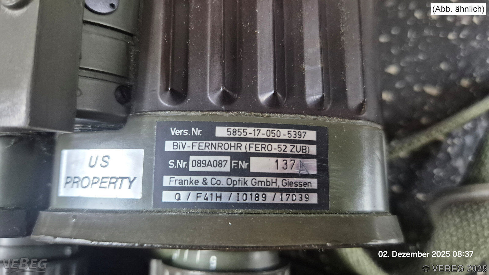BemerkungenTermine für Besichtigung oder Abholung sind mit der zuständigen Lagerortdienststelle verpflichtend vorab per Telefon /oder E-Mail zu vereinbaren.Ausfuhrgenehmigungspflichtig [Info] . Der Verkauf gebrauchter Elektro- und Elektronikgeräte im Sinne der Anlage 1 zu § 2 Abs. 1 ElektroG erfolgt ausschließlich an inländische Abnehmer mit deutscher Rechnungsadresse. Die Rechnungsstellung erfolgt zuzüglich der gesetzlichen Umsatzsteuer. GebotsbasisPostenBitte beachten Sie auch die Hinweise und Bedingungen im Vorspann zu dieser Ausschreibung: Die von der VEBEG angebotenen Waren stammen aus Aussonderungen ihrer Auftraggeber. Einzelheiten zum Zustand der jeweiligen Waren entnehmen Sie bitte den Lostexten. Insbesondere müssen technische Arbeitsmittel und Verbraucherprodukte i.S. des Geräte- und Produktsicherheitsgesetzes vor ihrer Verwendung instandgesetzt oder wiederaufgearbeitet werden. Zusätzlich verweisen wir ausdrücklich auf Abschnitte B und G unserer Allgemeinen Geschäftsbedingungen (AGB). Waren die nach Einschätzung der VEBEG der Ausfuhrgenehmigungspflicht unterliegen, sind mit Verweis auf die Punkte E3 und E4 unserer AGB entsprechend gekennzeichnet.Zum Gebotspreis kommt die gesetzliche Umsatzsteuer hinzu. Die Differenzbesteuerung gemäß § 25a UStG wird nur angewendet, wenn dies ausdrücklich in der jeweiligen Ausschreibung angegeben ist. | Lagerort / StandortBundeswehrPzBtl 203 GFM-Rommel-Kaserne Tel.: 05237 91-0 Herr Radeke Durchwahl: 2685 32832 Augustdorf |
