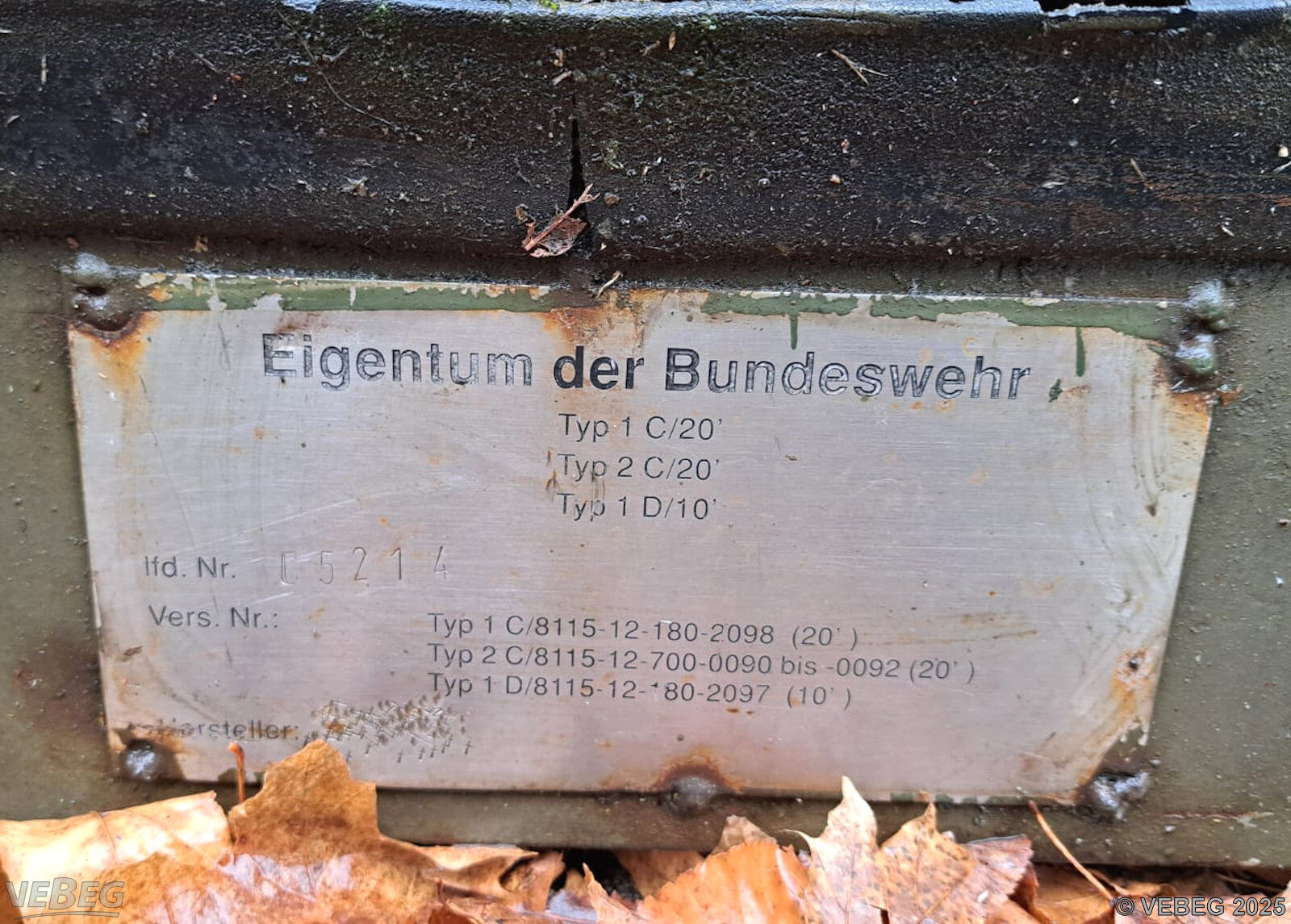 | BemerkungenTermine für Besichtigung oder Abholung sind mit der zuständigen Lagerortdienststelle verpflichtend vorab per Telefon /oder E-Mail zu vereinbaren.Telefonische Voranmeldung ist unbedingt erforderlich. Der Container steht in 87629 Füssen, Allgäu-Kaserne, Kemptener Straße 70. Keine Verladehilfe möglich. Die Rechnungsstellung erfolgt zuzüglich der gesetzlichen Umsatzsteuer. GebotsbasisStückBitte beachten Sie auch die Hinweise und Bedingungen im Vorspann zu dieser Ausschreibung: Die von der VEBEG angebotenen Waren stammen aus Aussonderungen ihrer Auftraggeber. Einzelheiten zum Zustand der jeweiligen Waren entnehmen Sie bitte den Lostexten. Insbesondere müssen technische Arbeitsmittel und Verbraucherprodukte i.S. des Geräte- und Produktsicherheitsgesetzes vor ihrer Verwendung instandgesetzt oder wiederaufgearbeitet werden. Zusätzlich verweisen wir ausdrücklich auf Abschnitte B und G unserer Allgemeinen Geschäftsbedingungen (AGB). Waren die nach Einschätzung der VEBEG der Ausfuhrgenehmigungspflicht unterliegen, sind mit Verweis auf die Punkte E3 und E4 unserer AGB entsprechend gekennzeichnet.Zum Gebotspreis kommt die gesetzliche Umsatzsteuer hinzu. Die Differenzbesteuerung gemäß § 25a UStG wird nur angewendet, wenn dies ausdrücklich in der jeweiligen Ausschreibung angegeben ist. | Lagerort / StandortBundeswehr-Dienstleistungs-zentrum Kaufbeuren FM 9 Fliegerhorst Apfeltranger Straße 15 Tel.: 08341 92-0 Durchwahl: 4136 oder 4139 87600 Kaufbeuren |