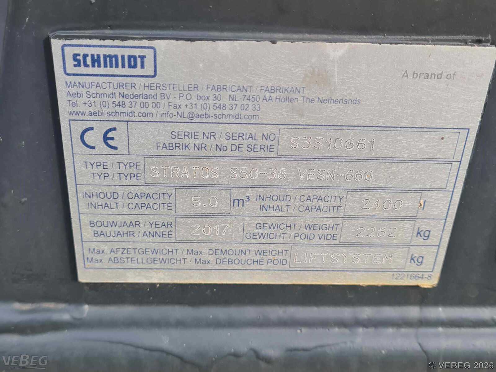 Baujahr 2017, S/N S3S10661; Nutzinhalt 5 m³/2.400 l, auf Abrollrahmen; ohne Bedienpult,