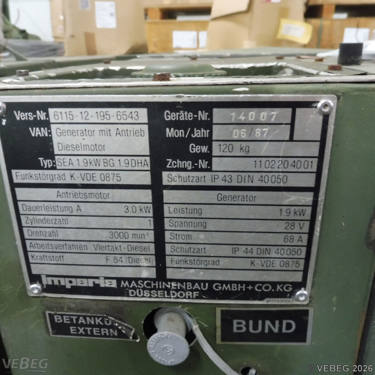 BemerkungenTermine für Besichtigung oder Abholung sind mit der zuständigen Lagerortdienststelle verpflichtend vorab per Telefon /oder E-Mail zu vereinbaren.Der Verkauf gebrauchter Elektro- und Elektronikgeräte im Sinne der Anlage 1 zu § 2 Abs. 1 ElektroG erfolgt ausschließlich an inländische Abnehmer mit deutscher Rechnungsadresse.Lagerhilfsmittel sind Eigentum der Dienststelle. Keine Verladehilfe möglich. Die Rechnungsstellung erfolgt zuzüglich der gesetzlichen Umsatzsteuer. GebotsbasisStückBitte beachten Sie auch die Hinweise und Bedingungen im Vorspann zu dieser Ausschreibung: Die von der VEBEG angebotenen Waren stammen aus Aussonderungen ihrer Auftraggeber. Einzelheiten zum Zustand der jeweiligen Waren entnehmen Sie bitte den Lostexten. Insbesondere müssen technische Arbeitsmittel und Verbraucherprodukte i.S. des Geräte- und Produktsicherheitsgesetzes vor ihrer Verwendung instandgesetzt oder wiederaufgearbeitet werden. Zusätzlich verweisen wir ausdrücklich auf Abschnitte B und G unserer Allgemeinen Geschäftsbedingungen (AGB). Waren die nach Einschätzung der VEBEG der Ausfuhrgenehmigungspflicht unterliegen, sind mit Verweis auf die Punkte E3 und E4 unserer AGB entsprechend gekennzeichnet.Zum Gebotspreis kommt die gesetzliche Umsatzsteuer hinzu. Die Differenzbesteuerung gemäß § 25a UStG wird nur angewendet, wenn dies ausdrücklich in der jeweiligen Ausschreibung angegeben ist. | Lagerort / StandortBundeswehrBwDp Süd PFU Verwertung MatLgr 2 Koordinaten 49.064088, 8.401188 Labor-Service-Straße Tel.: 0721 12081-0 - BwDpSuedMatLgrKARLgrBer@bundeswehr.org 76149 Karlsruhe-Neureut |