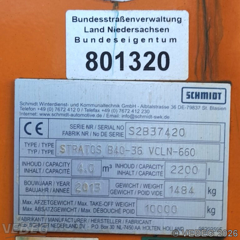 | BemerkungenTermine für Besichtigung oder Abholung sind mit der zuständigen Lagerortdienststelle verpflichtend vorab per Telefon /oder E-Mail zu vereinbaren.Die Rechnungsstellung erfolgt zuzüglich der gesetzlichen Umsatzsteuer. GebotsbasisStückBitte beachten Sie auch die Hinweise und Bedingungen im Vorspann zu dieser Ausschreibung: Die von der VEBEG angebotenen Waren stammen aus Aussonderungen ihrer Auftraggeber. Einzelheiten zum Zustand der jeweiligen Waren entnehmen Sie bitte den Lostexten. Insbesondere müssen technische Arbeitsmittel und Verbraucherprodukte i.S. des Geräte- und Produktsicherheitsgesetzes vor ihrer Verwendung instandgesetzt oder wiederaufgearbeitet werden. Zusätzlich verweisen wir ausdrücklich auf Abschnitte B und G unserer Allgemeinen Geschäftsbedingungen (AGB). Waren die nach Einschätzung der VEBEG der Ausfuhrgenehmigungspflicht unterliegen, sind mit Verweis auf die Punkte E3 und E4 unserer AGB entsprechend gekennzeichnet.Zum Gebotspreis kommt die gesetzliche Umsatzsteuer hinzu. Die Differenzbesteuerung gemäß § 25a UStG wird nur angewendet, wenn dies ausdrücklich in der jeweiligen Ausschreibung angegeben ist. | Lagerort / StandortStraßenmeisterei CelleBremer Weg 197 Tel.: 05141 27806-0 Frau Stimpel, Herr Flachsmeyer smcel@nlstbv.niedersachsen.de 29223 Celle | ||||||