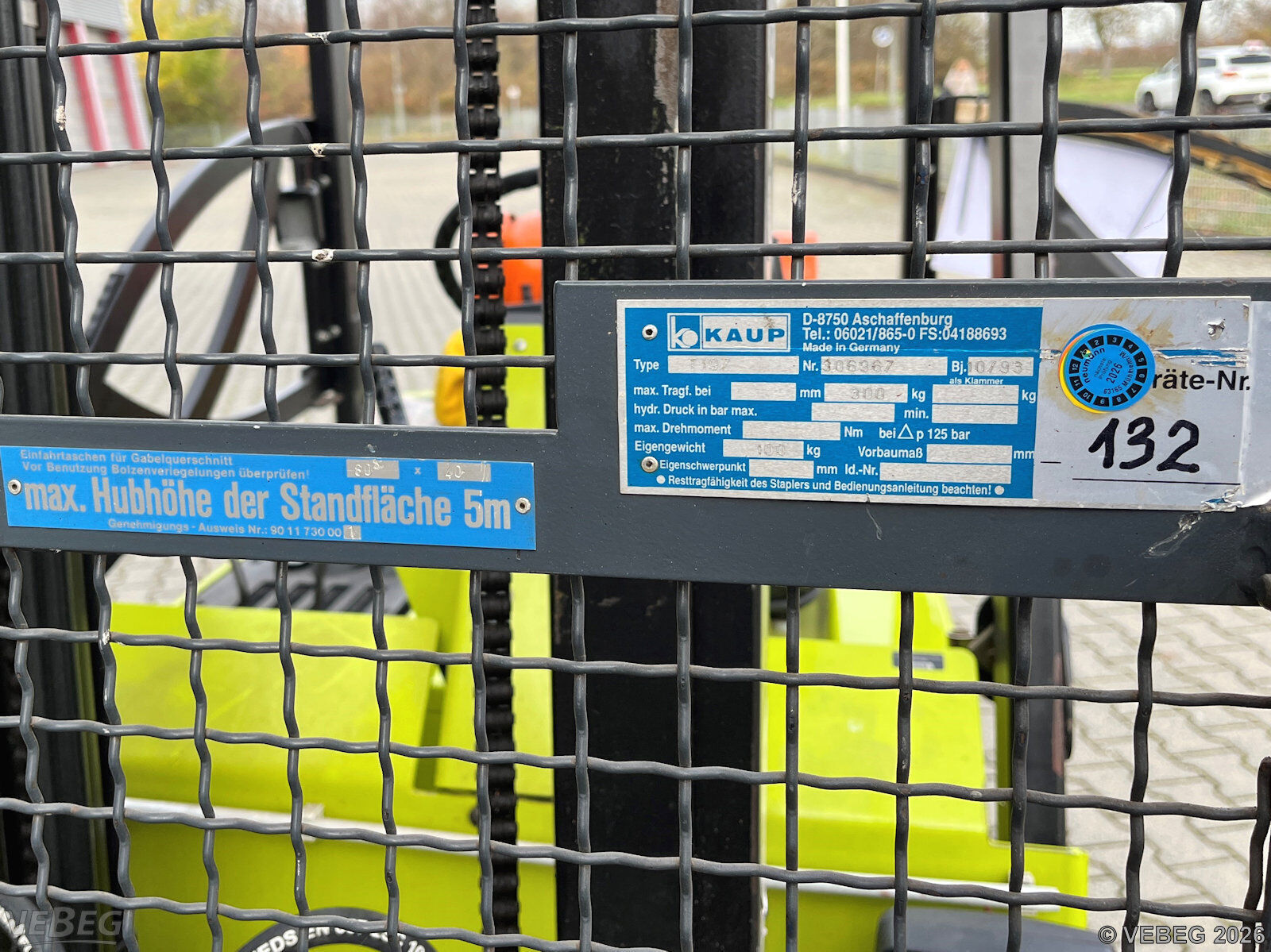 Baujahr 1993; Tragkraft 1,5 t; 485 Betriebsstunden; mit Arbeitskorb Kaup S/N 306967, Seitenschieber, Rundumkennleuchte;