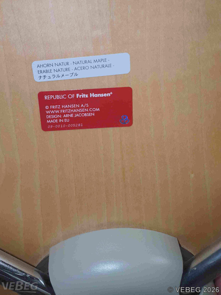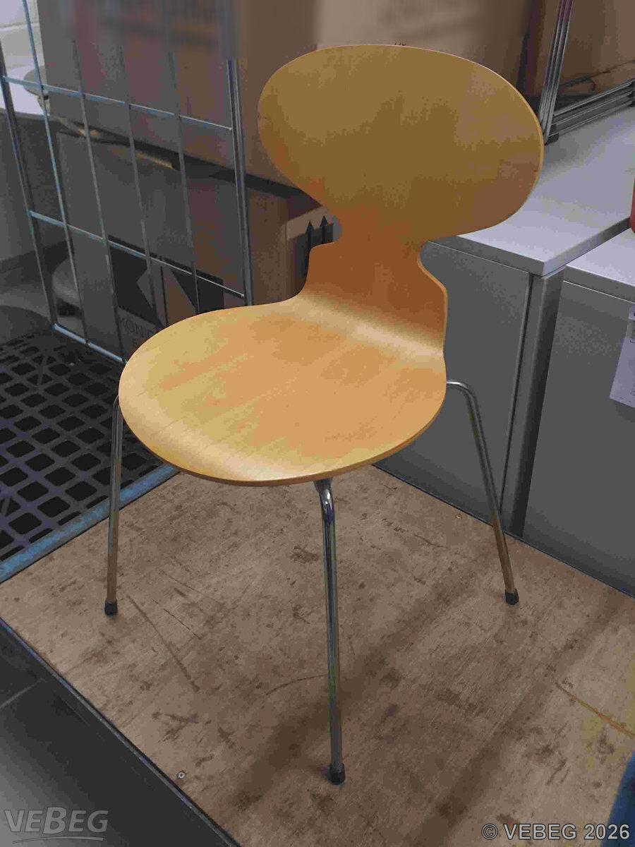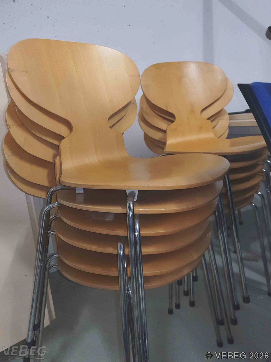 Designer Arne Jacobsen, Sitz aus formgepresstem Furnierholz, Beine aus verchromten Stahl, stapelbar;