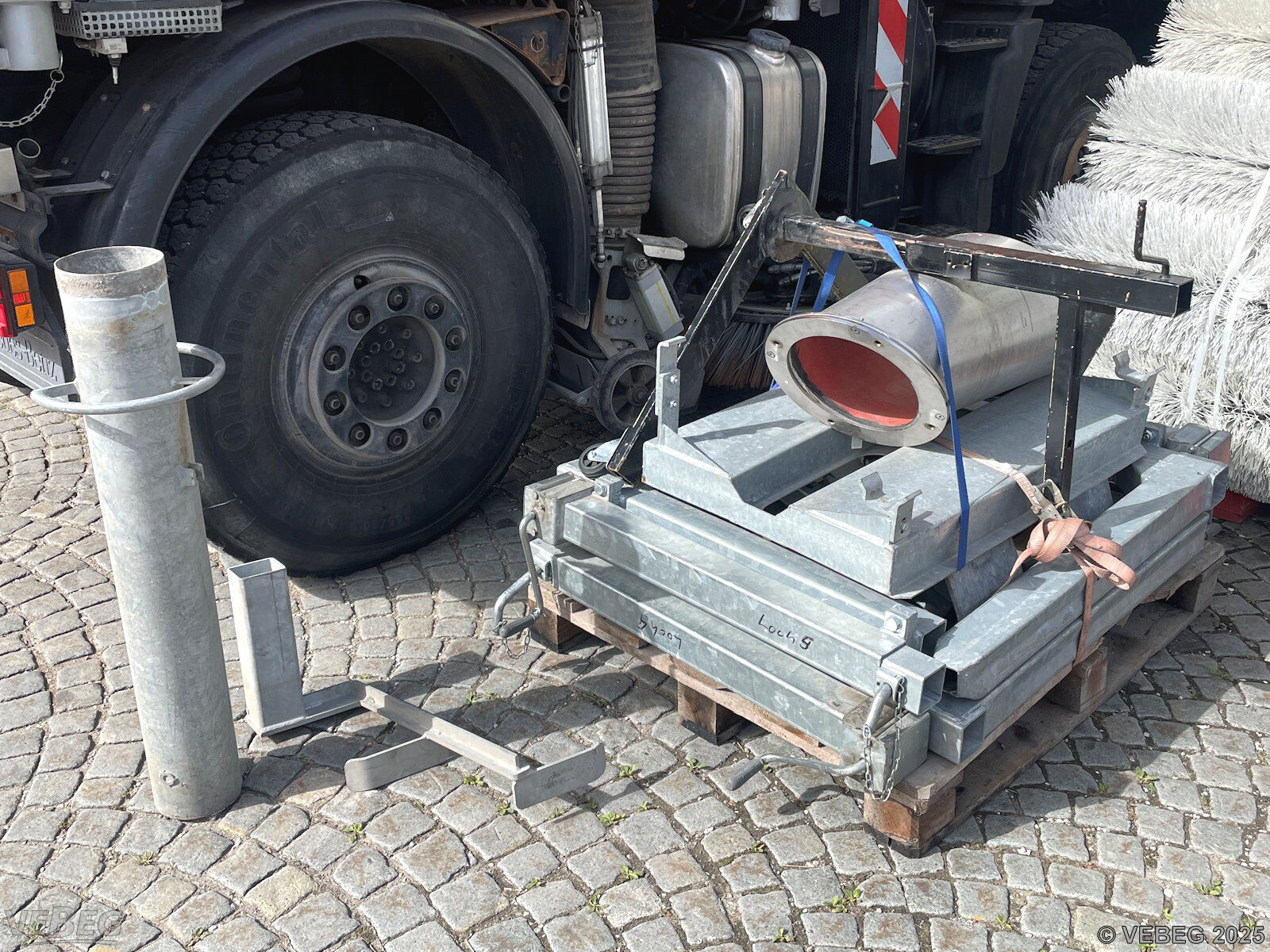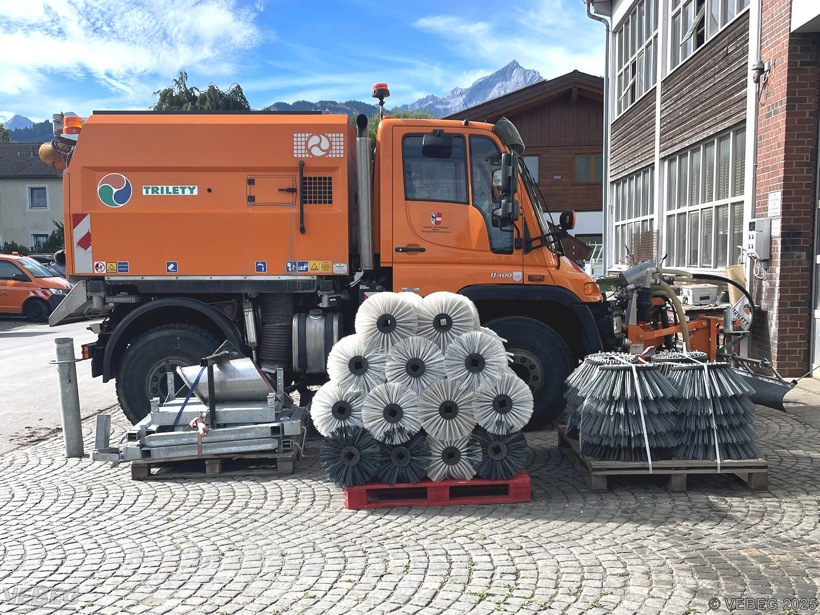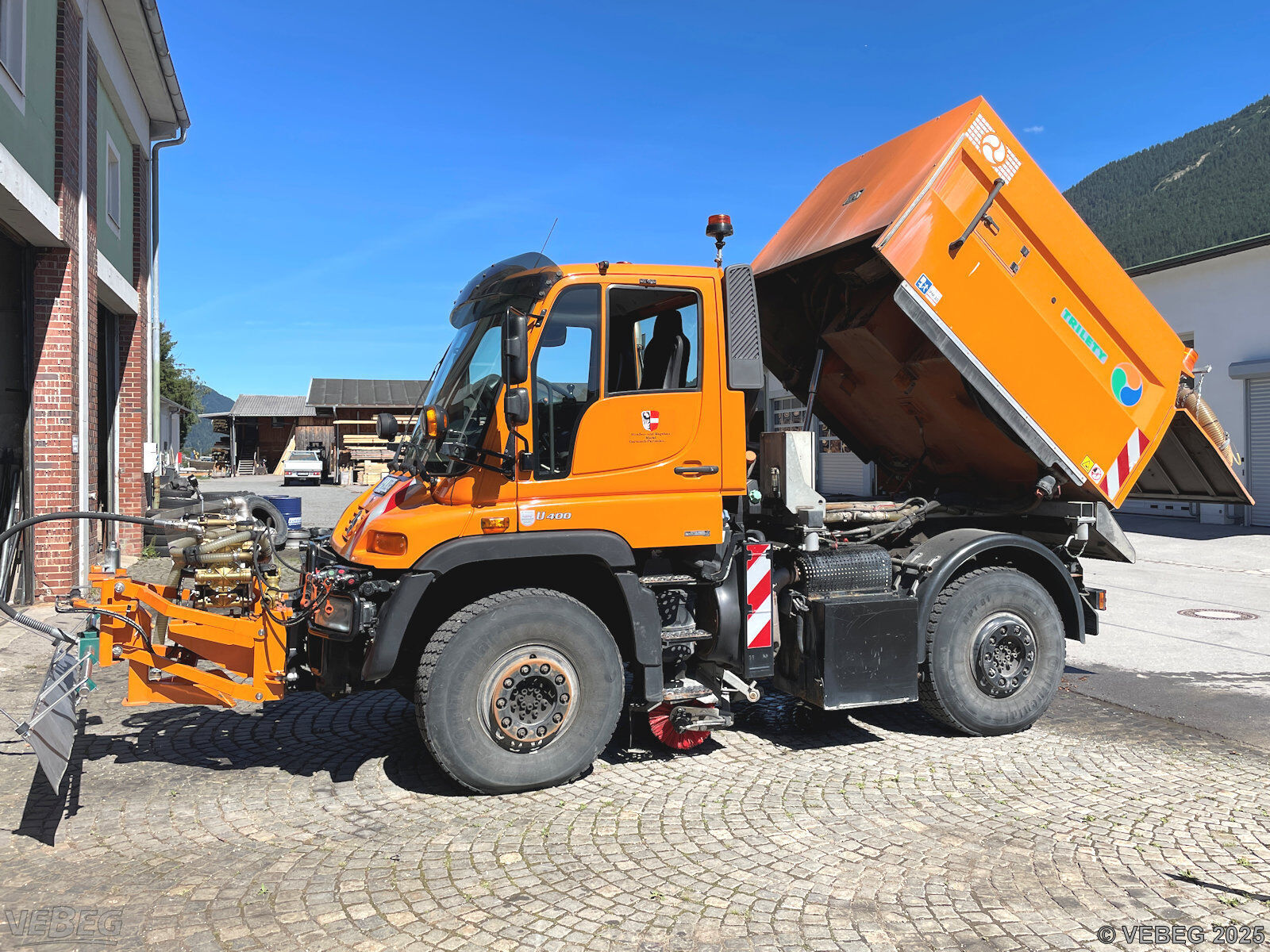 Motorleistung 210 kW, 9.581 Betriebsstunden; Kehrmaschinenaufbau Trilety TK358, Schwemmbalken Trilety WBT35, Kommunalhydraulik, Kipperzylinder, Rundumkennleuchten; Zubehör: 26 x Walzenbesen, 20 x Tellerbesen, Abstellstützen;